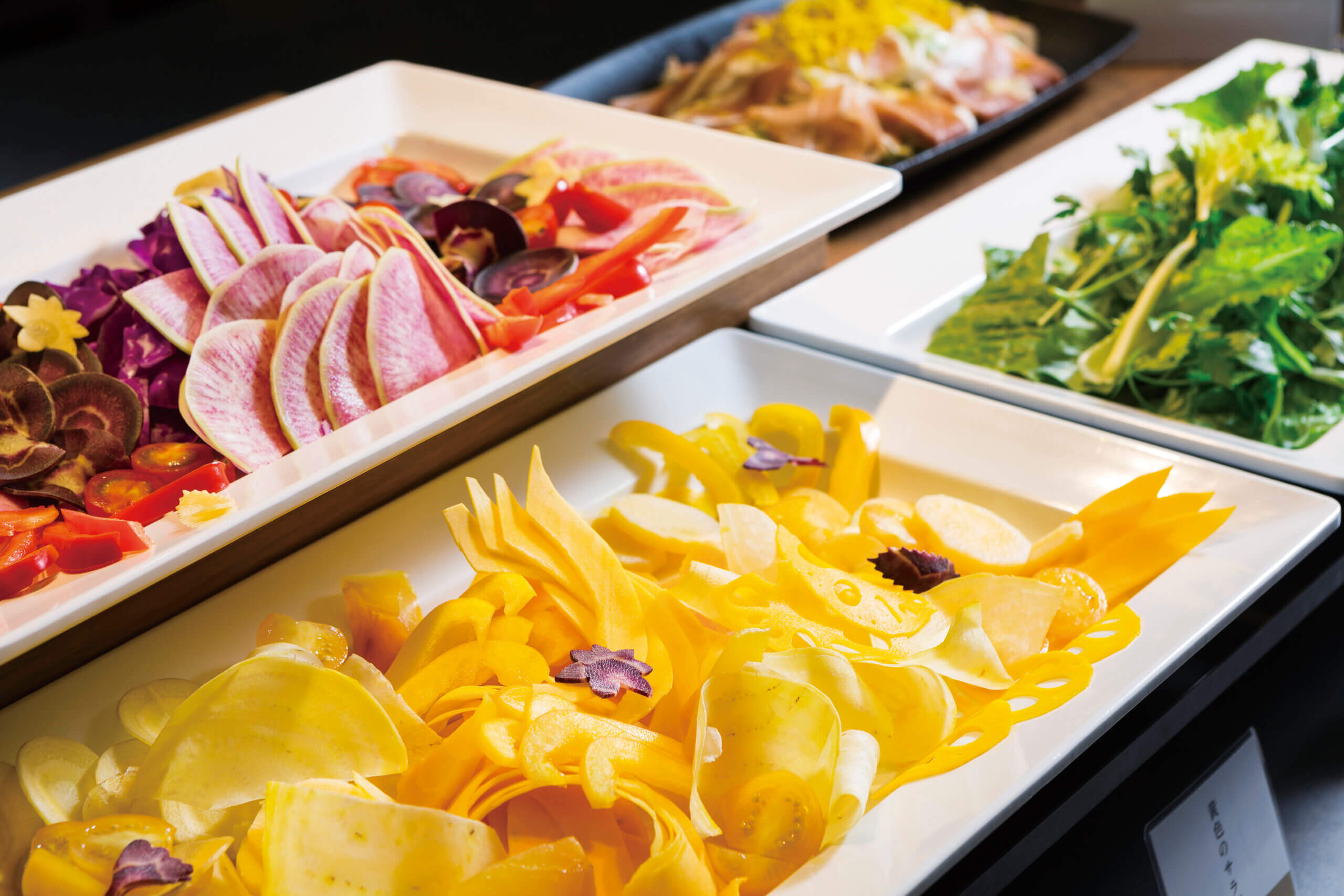 バリエーション豊かな旬の野菜をお楽しみください。朝のからだに取り入れたい鮮やかなフルーツなどもたっぷりご用意しています。