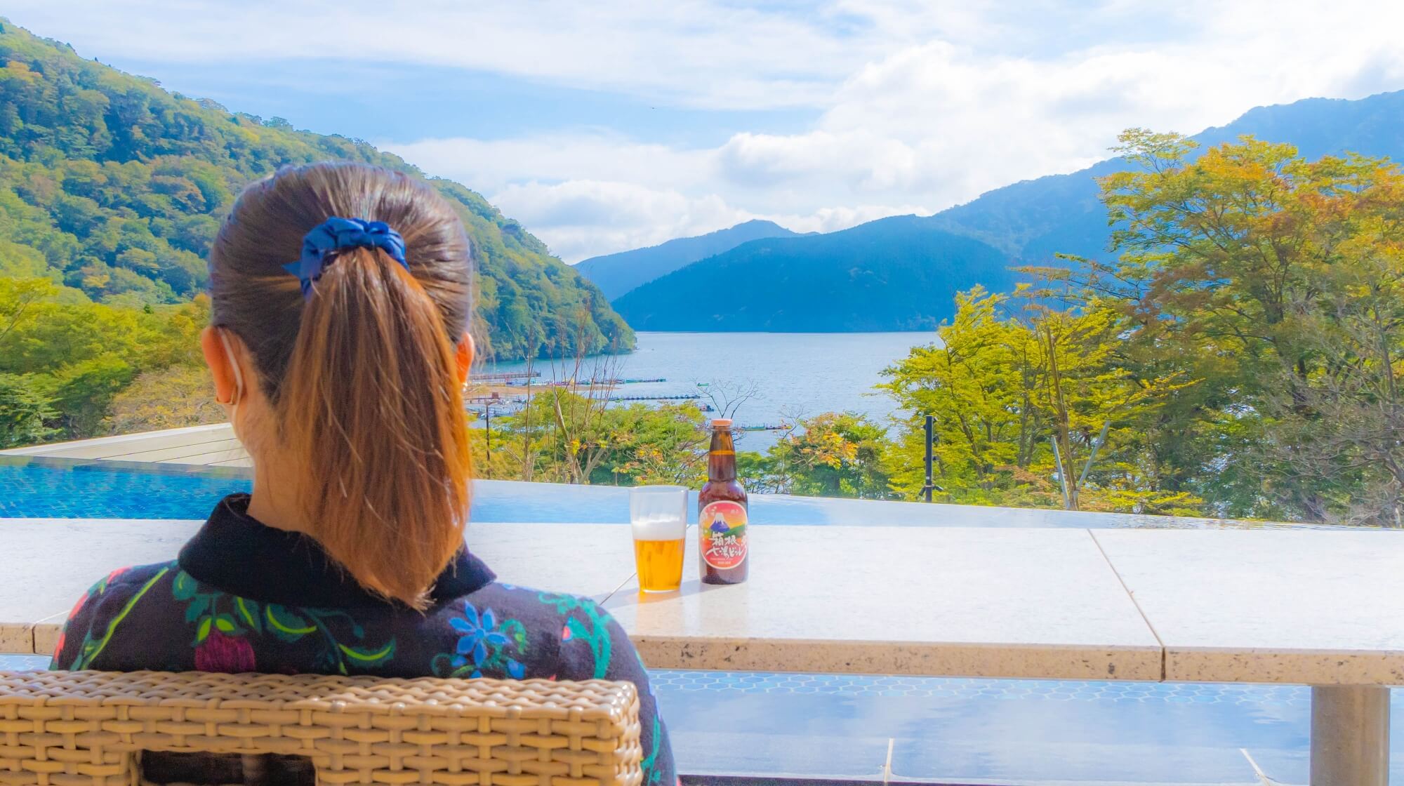 九頭龍神社から戻ったらチェックインをして足湯カウンターでひと休み。ラウンジで買った地ビールを片手に足湯で疲れた足をほぐす時間。